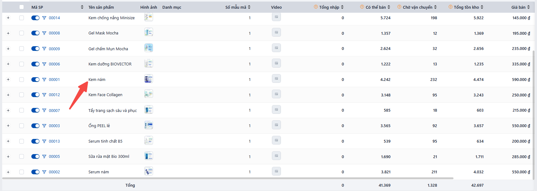 Ví dụ: Tìm sản phẩm "Kem nám" (SKU 00001)