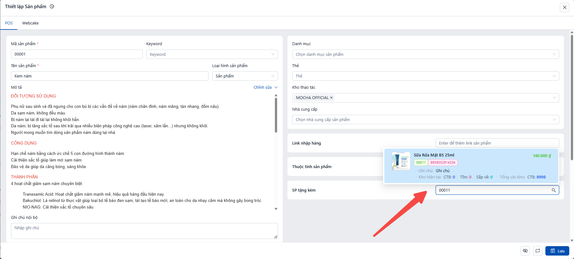 Ví dụ: Chọn "Sữa rửa mặt B5 25ml " (SKU 00011)
