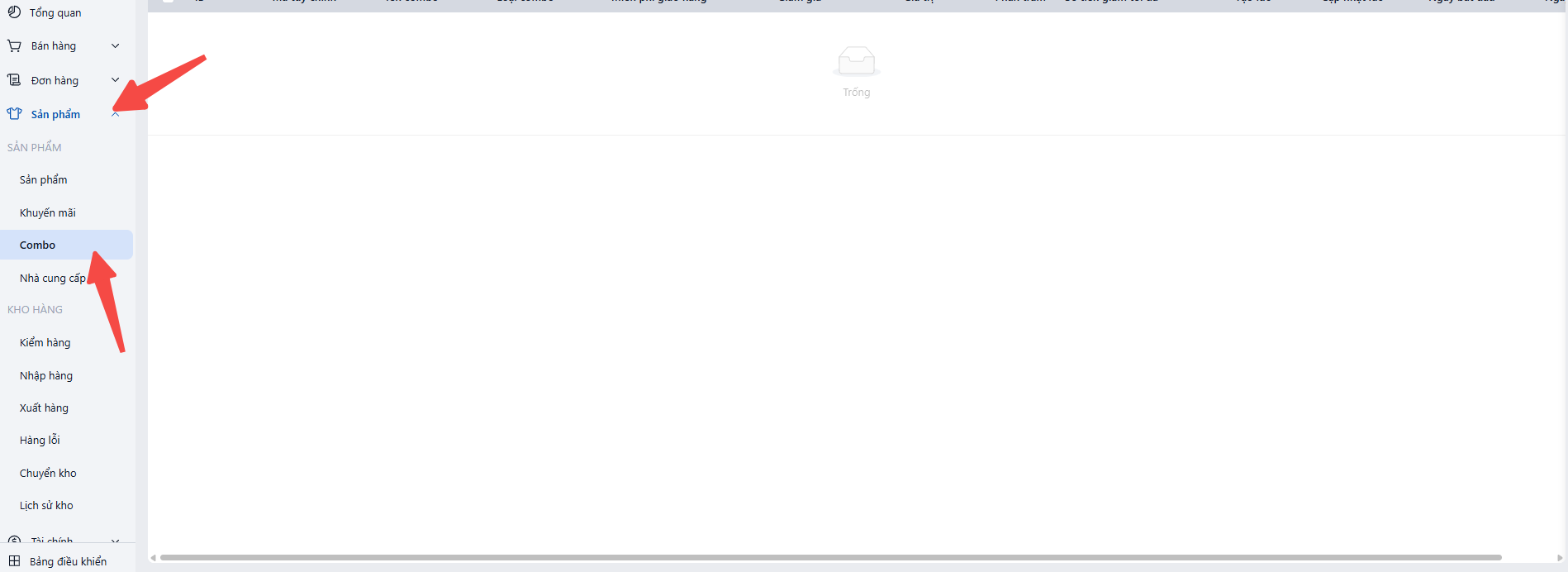 · Tại menu bên trái, chọn Sản phẩm → Combo