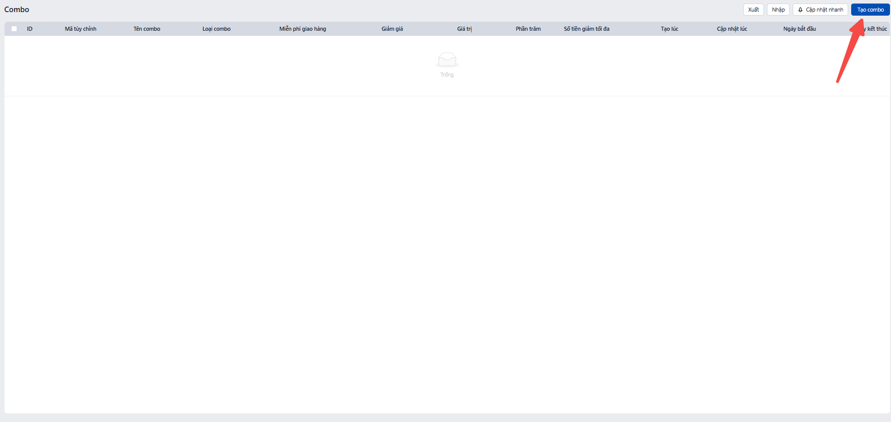 · Nhấn nút "Tạo combo" màu xanh ở góc phải trên