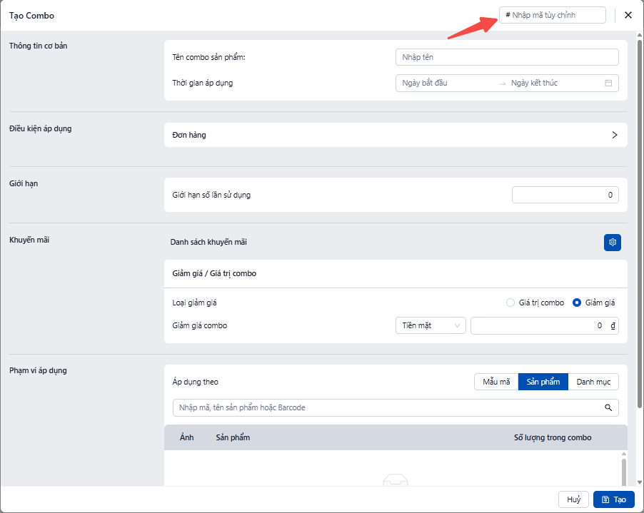 Bước 3: Nhập Mã Tùy Chỉnh (SKU Combo)