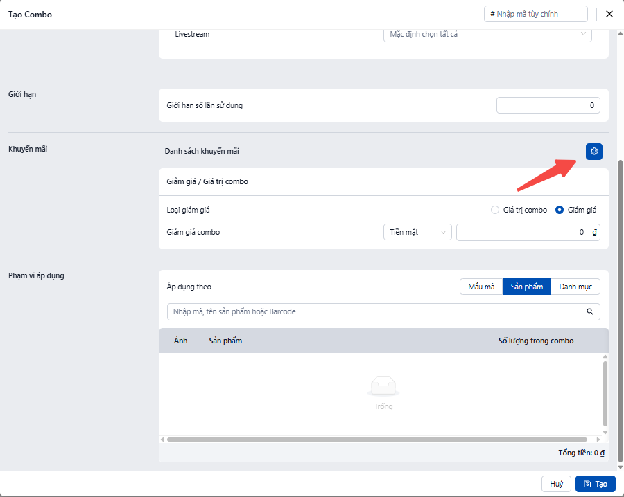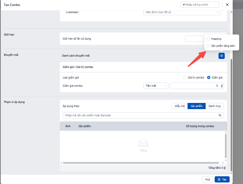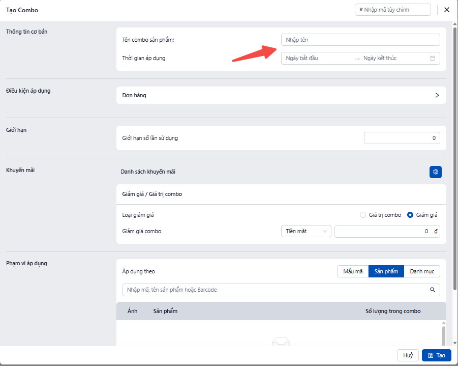 · Giao diện tạo combo sẽ hiện ra