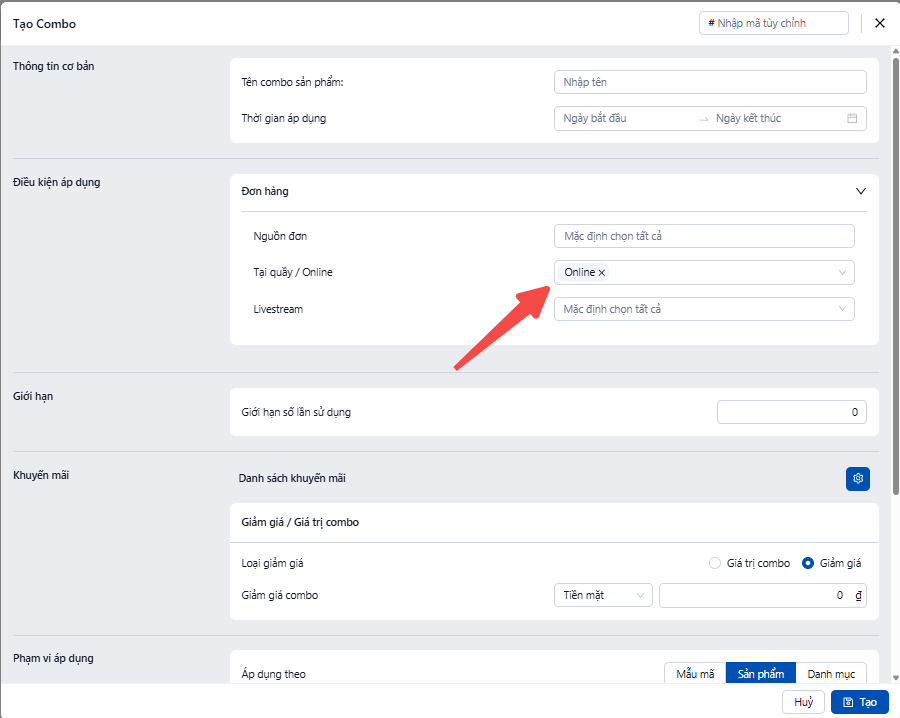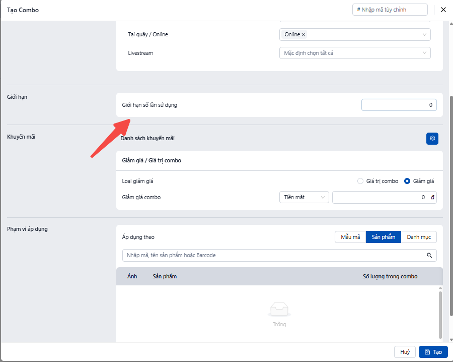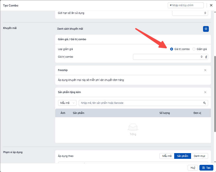 Tại phần "Giảm giá / Giá trị combo":