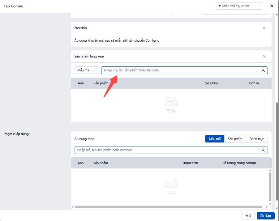 · Nhập mã SKU hoặc tên sản phẩm tặng kèm vào ô tìm kiếm