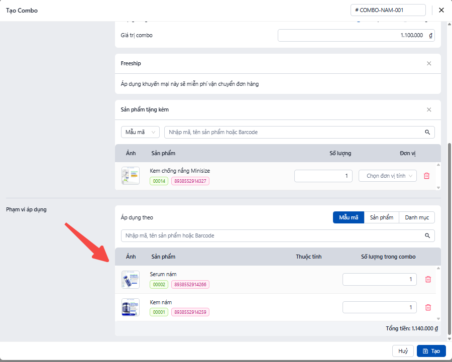 · Nhập mã SKU của từng sản phẩm trong combo